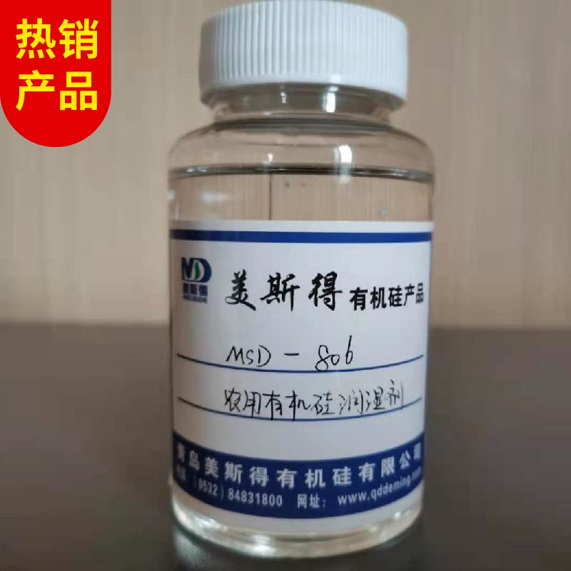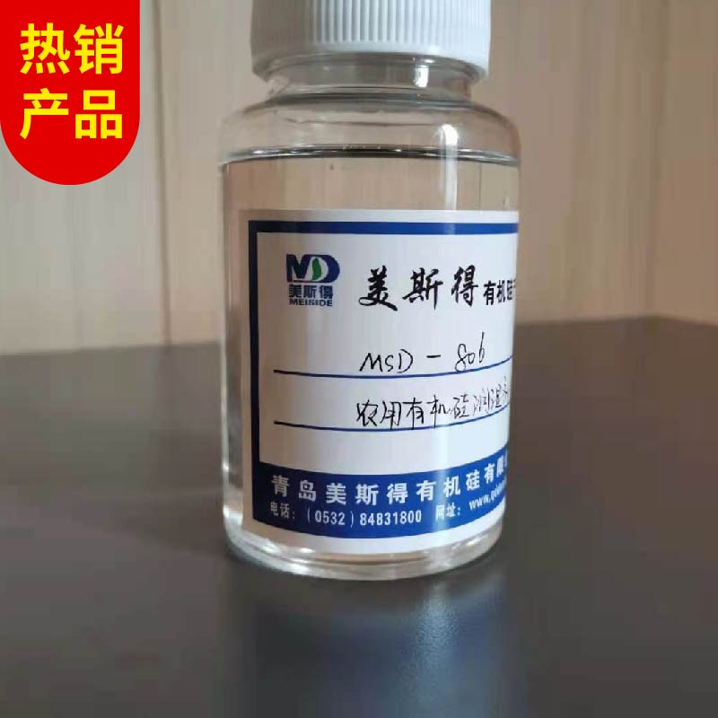 [用途]本品可以作为喷雾改良剂、叶面渗透吸收助剂、扩展剂等,广泛应用于除草剂、叶面肥、生长调节剂、杀虫剂、杀菌剂中,它对原药不分解,能大大降低溶液的表面张力,减少液滴与叶面之间的接触角,增强药液在植物叶面或害虫体表的湿润渗透、粘附及扩展能力,明显起到提高药效、降低药液喷洒量、减少喷药次数、节水、降低农药公害、促进环保的效果。[用法用量]本品与国外公司进口产品GE Silwet L-77, Silwet L-408, 杰效利性能类似,可以替代使用,比丝润润湿效果好。直接加入配制农药制剂配方中或作现混现用的桶混助剂用。作为现混现用时用量在0.02~0.04%之间(即15公斤的喷雾器里添加3~6克MSD-806)。在农药制剂配方中,用量在0.5~5%之间。[注意事项]由于有机硅表面活性剂的表面张力极低,在使用MSD-806时,应保护好眼睛,喷药作业时应加强个人防护。